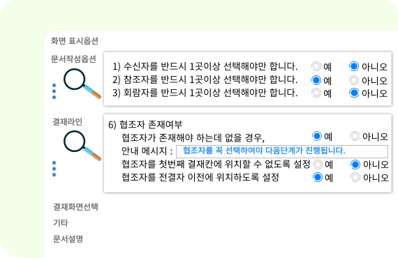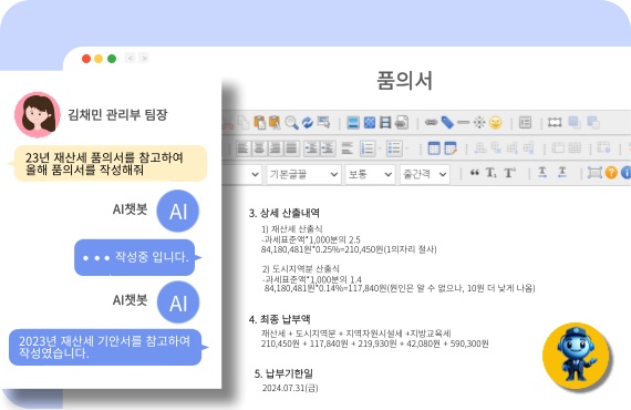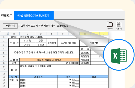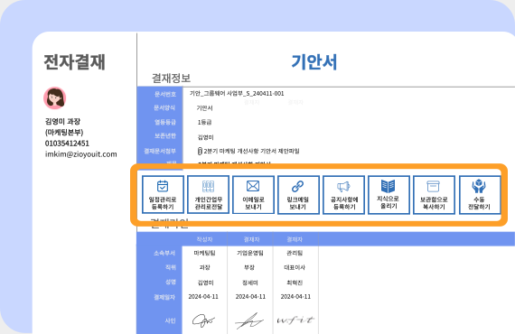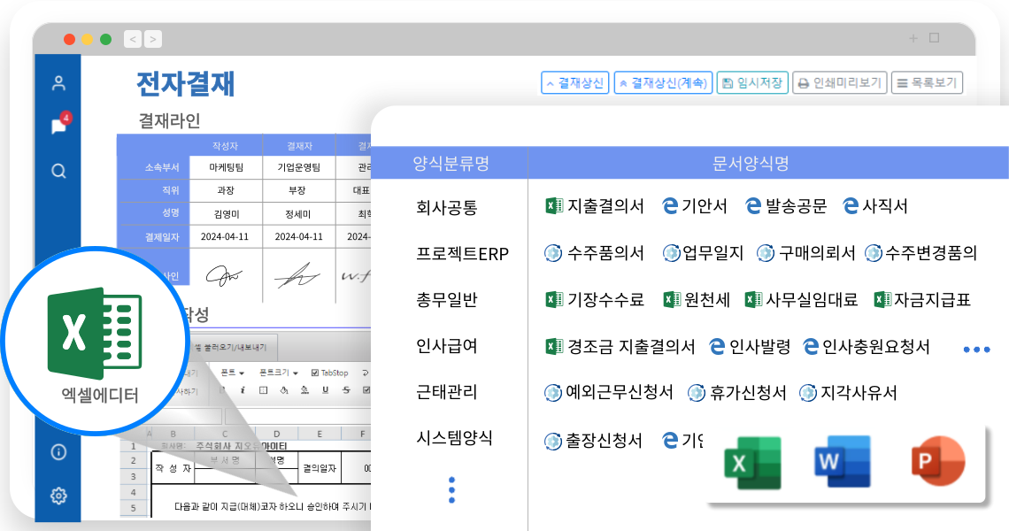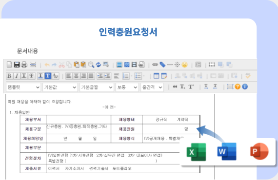 이보다 손쉽고 빠를수 없는복지왕 전자결재 행정업무편람 기준 각종 기관 서식지원, 국내 유일무이 엑셀에디터까지 제공합니다 소개자료 받기 Blog로 상세히 YouTube로 한눈에 편집기로 양식을 만든다구요? 붙여넣기와 업로드면 끝~!! 기관의 어떠한 양식도같은 모습으로 구현됩니다 전자결재의 핵심!!증빙구현이 바로 본문에서 결재문서의 첨부파일들이문서 본문에서 바로 구현됩니다 다양한 결재라인을 제공하고자동으로 불러와요 통제, 합의, 협조, 참조, 승인 등양식별로 결재라인을 자동호출합니다 자동작성 AI 기능으로손쉽고 빠르게 주간, 월간, 연간 반복되는 문서는 자동작성 기능으로 빠르게 작성됩니다. 국내유일무이엑셀에디터가 제공됩니다 기관에 존재하는 수 많은 엑셀양식 오직 복지왕만 제공되는 핵심기능 보존문서, 보관문서, 양식함 문서관리가 유연합니다 승인된 문서는 양식별로 문서보관이 자동으로 편철되요 문서간연결기능을 제공합니다 관련있는 문서끼리는 연결하여 한 눈에 파악됩니다 수신, 배포, 회람 등배포시기가 유연해요 문서공유 및 배포가 쉽고 배포시기도 조정이 가능합니다 근태 특화 양식으로집계정산을 한번에 휴가신청서, OT신청서 등자동 정산 양식이 제공됩니다. 다양한 경비정산 디지털증빙 양식을 제공해요 세금계산서와 법인카드영수증자동으로 전자문서로 호출 ERP 연동 양식으로전표도 한 번에 API 연동을 통해 ERP전표 입력도 자동으로 양식별 다양한 옵션을제공합니다 양식별로 의사결정에 관련된 디테일한 옵션을 제공합니다 통합검색 엔진으로해당 문서를 쉽게 찾아요 다양한 검색 옵션 설정으로원하는 문서만 쏙쏙 찾아드립니다 전자문서는 복지왕의 다른 메뉴로 연결이 가능해요 메일, 게시판, 업무관리, 프로젝트 등바로 연결이 가능합니다 모바일에서도손쉽게 전자문서를 승인해요 반응형 웹은 모바일에서도 빠른 의사결정이 가능케 합니다 지금 혼자서 인터넷으로만 알아보신다구요?결정권자와 현장에서 직접 확인하세요 무료방문요청 온라인PT요청 유튜브로 한 눈에