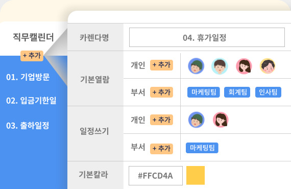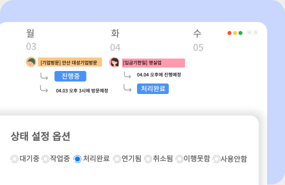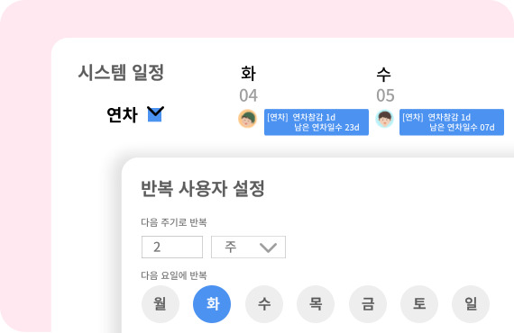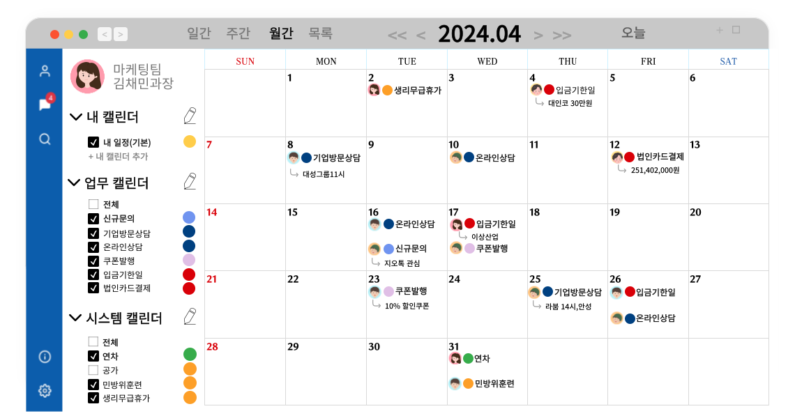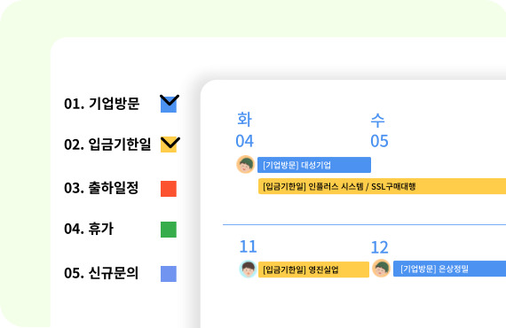 회사의 직무일정을 공유하고 조율하는복지왕 일정관리 기관의 일정관리는 성과관리의 필수 요소입니다 소개자료 받기 Blog로 상세히 YouTube로 한눈에 보기 좋은 달력의 모습을 한 화면에 빠르고 한 번에 월간/주간/일간/리스트 등전체일정을 한 눈에 볼 수 있습니다 캘린더 생성은누구든지 가능해요 부서별, 업무별 캘린더를누구나 생성해서 관리할 수 있습니다 캘린더 선택으로원하는 일정만 볼 수 있어요 전사일정, 휴가 및 외근 일정 등내가 보고 싶은 일정만 볼 수 있습니다 일정을 일일이등록한다구요? NO!! 반복일정, 근태 등의 시스템 일정은 자동으로 표기됩니다 지금 스케줄의진행상태를 알고 싶나요? 7가지 상태 설정을 통해 캘린더에서 바로 확인하세요 다른 구성원의 일정이 궁금해요 타인 일정 조회로일정 조율이 가능해요 내 손안에 캘린더 모바일에서도 일정 푸쉬를 받아요 지금 혼자서 인터넷으로만 알아보신다구요?결정권자와 현장에서 직접 확인하세요 무료방문요청 온라인PT요청 유튜브로 한 눈에