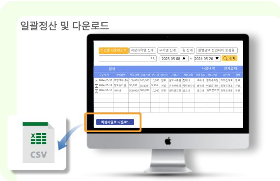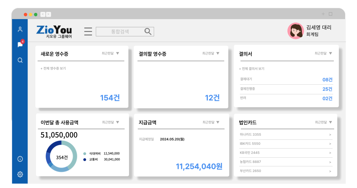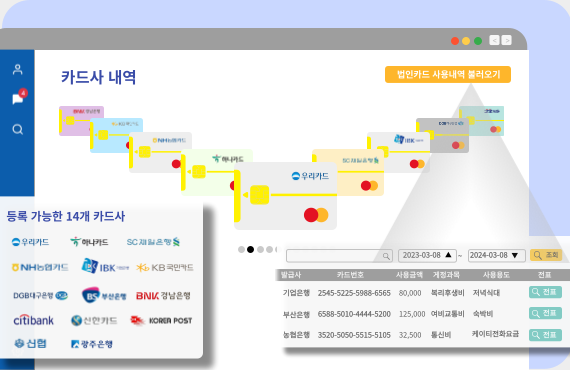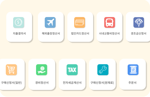 모든 비용지출을 한 눈에!경비지출관리 종이영수증 없는 디지털 증빙으로! 경비지출관리와 함께 손쉽게 일해요 소개자료 받기 Blog로 상세히 YouTube로 한눈에 14개 모든 카드사 내역을 한 번에 확인해요 카드사별 사용내역을 실시간 한 화면에서 볼수 있습니다 지출특성에 맞는다양한 양식을 제공해요 준비된 양식으로 고민없이 빠르게 시행하세요 종이영수증 더이상 NO!! 전자영수증 Yes!! 계산서,세금계산서,법인카드영수증이지출증빙으로 연결됩니다 법인카드 번호별 실사용자 구분이 쉬워요 카드별 실사용자와 열람대상자를 지정하여 관리할수 있습니다 지출증빙에 필요한다양한 세부항목을 제공해요 계정별 과목, 결제수단, 부가세, 결제일시, 프로젝트코드, 환율 등을 제공해요 ERP랑 연동되어 전표가 자동으로 입력되요 각종 지출증빙 문서는 ERP랑 연동되어 전표 입력을 따로 할 필요가 없습니다 일괄 정산 및 집계가 용이해요 자동 리포트가 생성되어 엑셀 파일로도 활용해요 모바일에서 실시간 알림과 조회가 가능해요 언제어디서나 지출증빙 결재를 상신하고 열람할수 있어요 지금 혼자서 인터넷으로만 알아보신다구요?결정권자와 현장에서 직접 확인하세요 무료방문요청 온라인PT요청 유튜브로 한 눈에