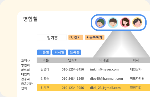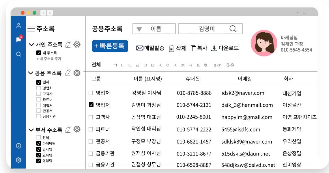 강력한 네트워크를 관리하는 연결의 힘복지왕 인맥관리 우리 기관의 소중한 인맥 네트워크를 체계적으로 관리하세요 소개자료 받기 Blog로 상세히 YouTube로 한눈에 연락처를 손쉽게 등록해요 빠른 등록화면과 명함인식기술로 등록이 쉽습니다 개인 명함철을사주고 계신다구요? No! 자주쓰는 연락처는 구성원들과 한곳에서 같이 공유하고 관리합니다 메일과 문자 발송시주소록의 정보가 쏘옥~! 수신자의 메일 주소와전화번호가 자동으로 따라옵니다 주요 인맥들의기념일을 챙겨요 워크시트를 통해 축하 메세지나 이메일을 자동 발송합니다 예약발송을 통해정해진 시간에 발송해요 공지사항이나 회의시작 전 알림을 예약 걸어 발송해보세요 수 많은 주소록을한 번에 올리고 내보내요 Import / Export 기능으로 손쉽게 업/다운로드가 가능해요 지금 혼자서 인터넷으로만 알아보신다구요?결정권자와 현장에서 직접 확인하세요 무료방문요청 온라인PT요청 유튜브로 한 눈에
