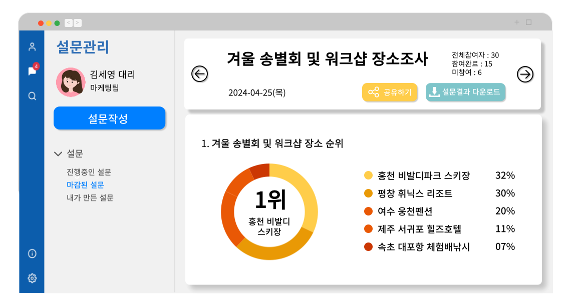 간단한 설문 작성부터 심층 조사까지복지왕 설문관리 소개자료 받기 YouTube로 한눈에 기관 구성원 뿐만 아니라 외부인원까지 우리 기관 구성원 뿐만 아니라 불특정 다수의 설문도 수집할 수 있어요 익명기능도 제공해요 익명설문조사로 정확하고솔직한 답변을 기대해요 각 상황에 맞는설문 템플릿을 제공해요 한 번 만든 설문은 언제든 복사하세요보기좋은 템플릿으로 간편하게 작성하세요 신뢰도와 타당도를높혀라 객관형, 순위형, 서술형 등 질의특성에 맞는 형태를 선택합니다 설문 결과가한 눈에 다양한 그래프로 결과 파악이 쉽고엑셀 다운로드가 가능하여 가공이 가능합니다 지금 혼자서 인터넷으로만 알아보신다구요?결정권자와 현장에서 직접 확인하세요 무료방문요청 온라인PT요청 유튜브로 한 눈에